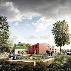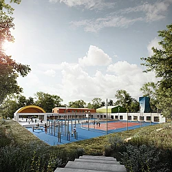 Each of the four courtyards has a specific character. The largest area is designated for playgrounds and sports facilities. It is an intense collage of colors and surfaces. The interior and exterior are connected by a concrete skatepark. The arched roof over part of the skatepark serves as a visual gateway to the site. The second courtyard is a climbing center with an outdoor wall, bouldering space, and a parkour playground. A rope course can be stretched between the trees. The third, southeastern, courtyard is the most peaceful. Therefore, a playground for the children's group and a fire pit are located here. The fourth courtyard is a long space along the entrance to the site. On the sports facilities side, there is a pedestrian path, a new concrete panel road.