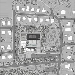 Díky terénní konfiguraci se jedná o autonomní území, zelený ostrov. Porosty na terénních svazích jsou objemné a kompaktní. Plocha areálu je členěna do 4 nádvoří, která pokaždé rámuje ze dvou stran architektura a ze dvou stran příroda. Za vysokými světlými omítnutými stěnami vystupují vyšší hmoty zvýrazněné tvarem a barvou. Chodby již nejsou bariéra ale podloubí pro kontakt a setkávání.