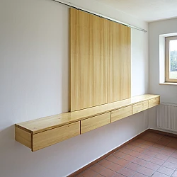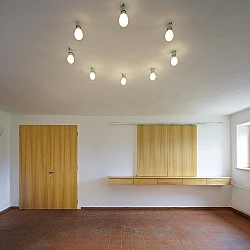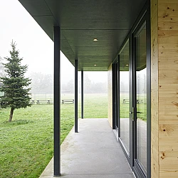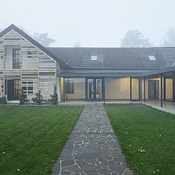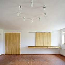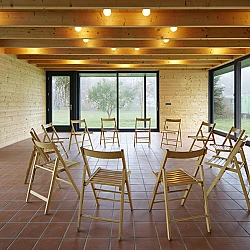 Some of the rooms have special importance to the Community. Community room – room where the group therapy takes place – is the only space that protrudes out of the farmstead circumference. The meaning of it is that the therapy is a special occasion. All troubles and memories are blown away to the orchard via sliding glass walls. The symbol of a circle is formed of simple lights on the ceiling or arrangement of chairs. Glass corridor inserted into the courtyard is a vivid place where clients meat and talk. It connects the courtyard to all spaces of the community. The Club is a spacious common room built inside the barn. It is the spot where clients and therapists meet informally. The clients alone prepare the food and cook. Daily meal is an important ritual. Dining room is set in the oldest corner of the farm, where the remains of old stone walls are visible. A small stone portal was restored to highlight the entrance to this room.