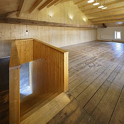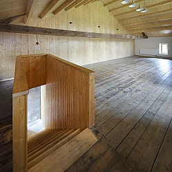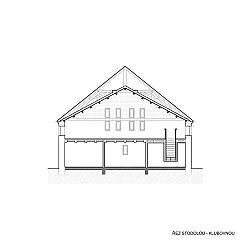 Původní dřevěné patro ve stodole je nově upraveno na neformální klubovnu komunity. Je to jeden velký prostor, kde se „mimo službu“ potkávají terapeuti s klienty. Vestavba je konstruována nezávisle na krovu a zateplena z vnitřní strany kamenného zdiva. Ubytování pro 20 klientů je v jednoduchých podkrovních pokojích. Vzniklo přestavbou původních patrových apartmánů a využitím prázdné půdy. Vložená společná komunikace je na obou koncích schodišti spojena s dvorní skleněnou chodbou. Část dispozice pro klienty je tak uzavřena do dalšího symbolického kruhu.