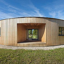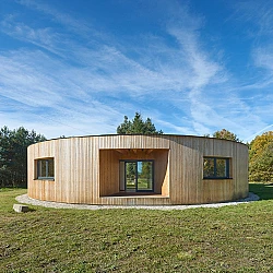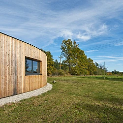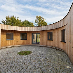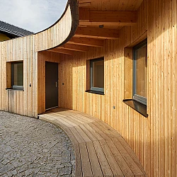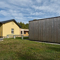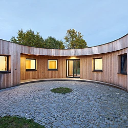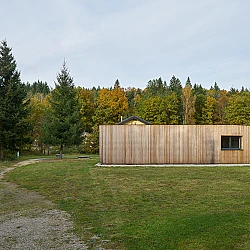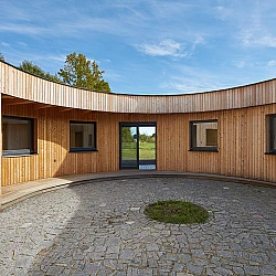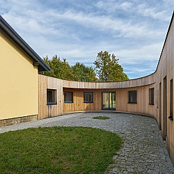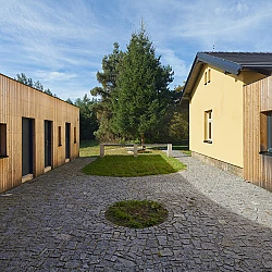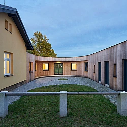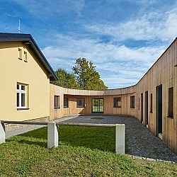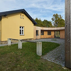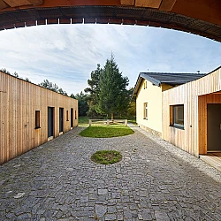Drážní domek (wechterovna) zůstal zachován jako dominanta a společný obytný prostor v původních materiálech a barvách. Dostavba obytné části jej propojila s rekonstruovaným hospodářským objektem. Vznikla nová usedlost ve tvaru podkovy s polokruhovým chráněným dvorem, sjednocená modřínovou fasádou. V interiéru jsou záměrně využity stejné konstrukční prvky a materiály jako v objektu terapeutické komunity. Kontinuita architektury doplňuje kontinuitu léčby.