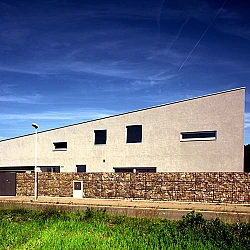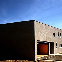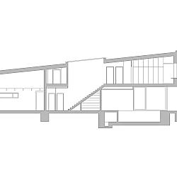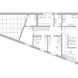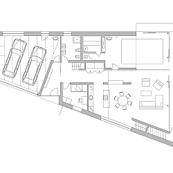 As a reaction to such conditions we designed simply shaped prismatic building, which conceals the structure of the interior. The trapezoidal circumference of the building is influenced by the shape of the plot. The compact irregular volume enables to hide the real scale of the house. The austere geometric appearance is in tune with the simple shape of the whole building. Only the tilted entrance and the overhang of the summer terrace cut the volume of the house. The windows of the rooms are mounted to the edge of the facade and have sun-reflecting glazing. Widows of service rooms use common glazing and are set deeper into the wall. In the nice weather there can be recognized the difference between shiny and dark openings.